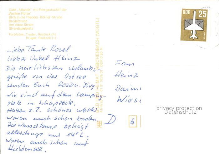 72325887 alte Postkarte Warnemuende Ostseebad Cafe Atlantik mit Fahrgastschiff Theodor Koerner Strasse Alter Strom postalisch gelaufen Erhaltung siehe scans KatCode: 11110013003000