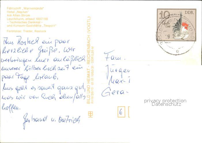 72247159 alte Postkarte Warnemuende Ostseebad Faehrschiff Hotel Neptun Alter Strom Leuchtturm Konsum Gaststaette Teepott postalisch gelaufen Erhaltung siehe scans KatCode: 11110013003000