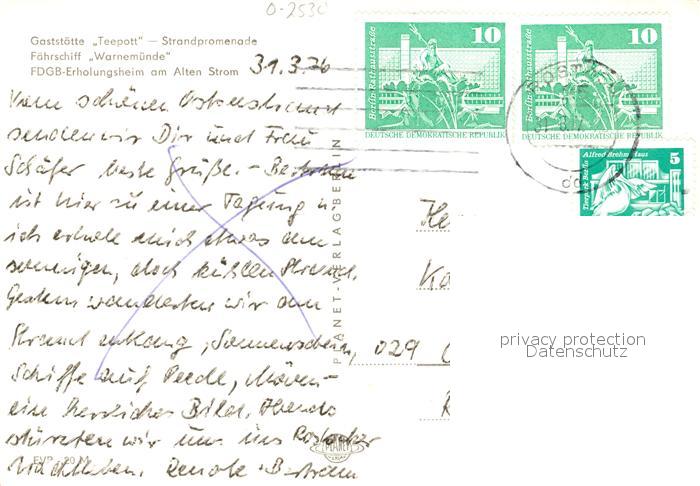 73030656 alte Postkarte Warnemuende Ostseebad Gaststaette Teepott Strandpromenade Faehrschiff Warnemuende postalisch gelaufen Erhaltung siehe scans [KathaD81] KatCode: 11110013003000