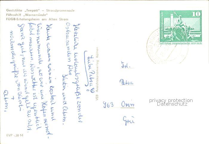 72477067 alte Postkarte Warnemuende Ostseebad Gaststaette Teepott Strandpromenade Faehrschiff Warnemuende postalisch gelaufen Erhaltung siehe scans KatCode: 11110013003000