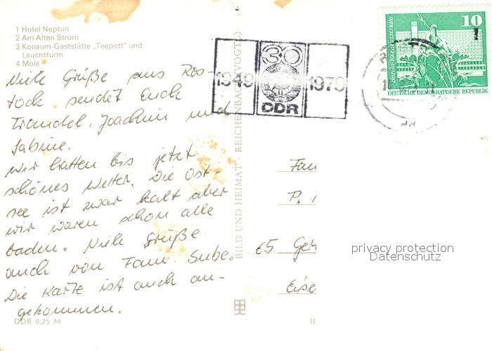 73575330 alte Postkarte Warnemuende Ostseebad Hotel Neptun Alter Strom Fischkutter Konsumgaststaette Teepott Leuchtturm Mole postalisch gelaufen Erhaltung siehe scans [FriedD77] KatCode: 11110013003000