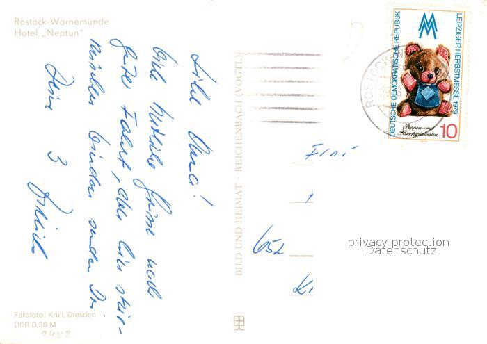 73167856 alte Postkarte Warnemuende Ostseebad Hotel Neptun bei Nacht postalisch gelaufen Erhaltung siehe scans [LiesaD40] KatCode: 11110013003000