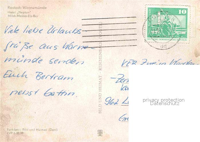 72726459 alte Postkarte Warnemuende Ostseebad Hotel Neptun Milch Mokka Eis Bar postalisch gelaufen Erhaltung siehe scans [FriedD77] KatCode: 11110013003000