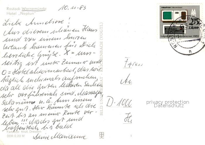 73230406 alte Postkarte Warnemuende Ostseebad Hotel Neptun Nachtaufnahme postalisch gelaufen Erhaltung siehe scans [FriedD77] KatCode: 11110013003000
