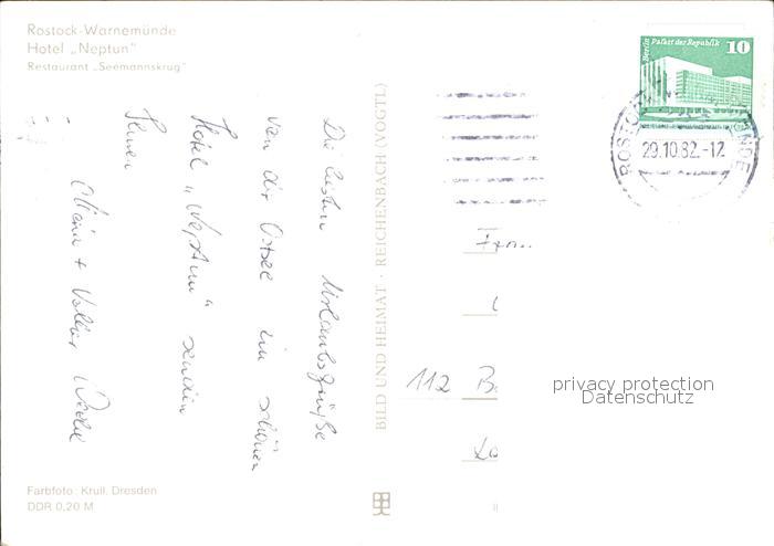 72106848 alte Postkarte Warnemuende Ostseebad Hotel Neptun Restaurant Seemannskrug postalisch gelaufen Erhaltung siehe scans KatCode: 11110013003000