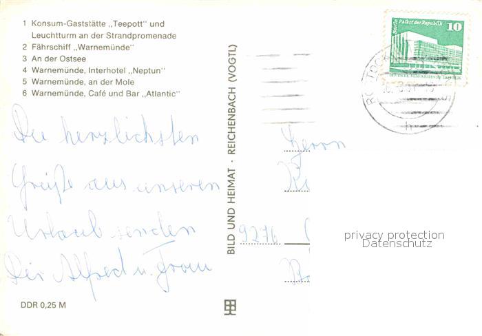 72728595 alte Postkarte Warnemuende Ostseebad Konsum Gaststaette Teepott Leuchtturm Mole Faehre Strand Hotel Neptun Cafe Bar Atlantic postalisch gelaufen Erhaltung siehe scans [FriedD77] KatCode: 11110013003000