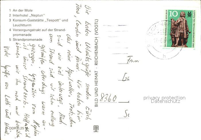 72344308 alte Postkarte Warnemuende Ostseebad Mole Interhotel Neptun Gaststaette Teepott Leuchtturm Versorgungstrakt Strandpromenade postalisch gelaufen Erhaltung siehe scans KatCode: 11110013003000