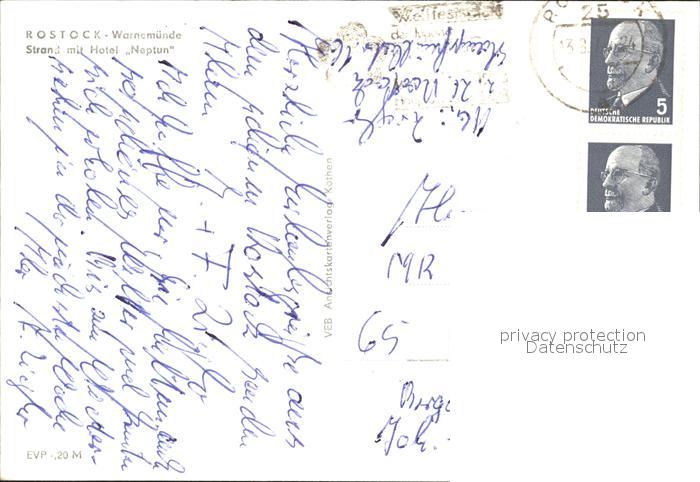 alte Postkarte Warnemuende Ostseebad Strand mit Hotel Neptun postalisch gelaufen Erhaltung siehe scans