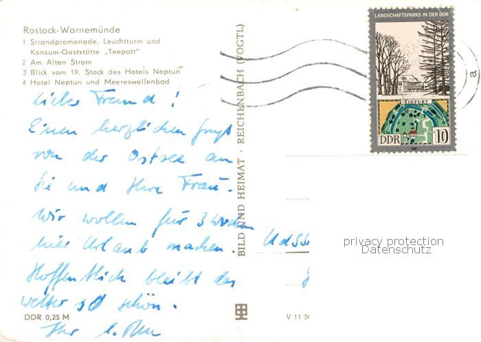 73834759 alte Postkarte Warnemuende Ostseebad Strandpromenade Leuchtturm Teepott Am Alten Strom Hafenpartie Hotel Neptun postalisch gelaufen Erhaltung siehe scans [WerneD78] KatCode: 11110013003000