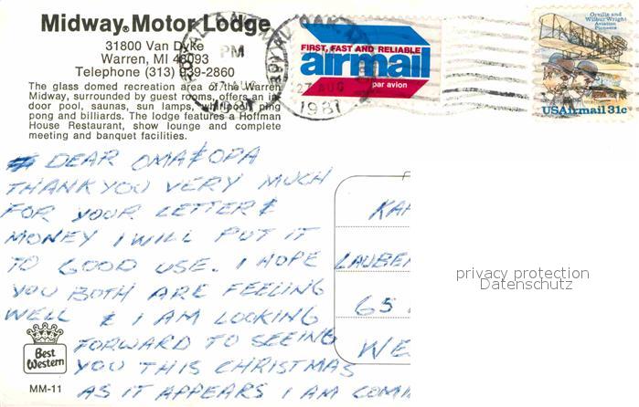 72794719 old postcard Warren Michigan Midway Motor Lodge Schwimmbad postalisch gelaufen Erhaltung siehe scans [LiesaD40] KatCode: 14140240000000