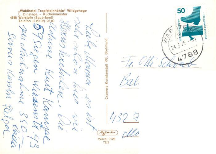 73893982 alte Postkarte Warstein Waldhotel Tropfsteinhoehle Wildgehege postalisch gelaufen Erhaltung siehe scans [FriedD77] KatCode: 11110005974044
