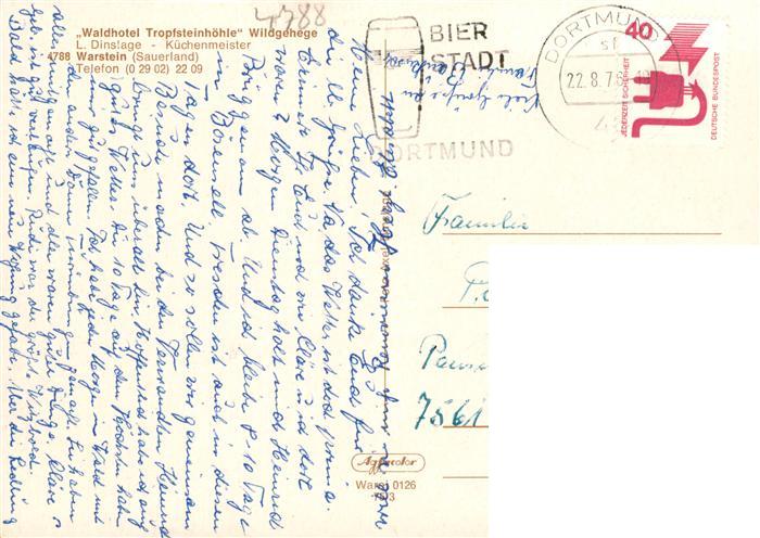 73934497 alte Postkarte Warstein Waldhotel Tropfsteinhoehle Wlldgehege postalisch gelaufen Erhaltung siehe scans [WerneD78] KatCode: 11110005974044