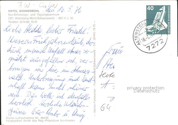 72050407 alte Postkarte Wart Altensteig Hotel Sonnenbuehl Kurzentrum Tagungszentrum Schwarzwald Fliegeraufnahme postalisch gelaufen Erhaltung siehe scans KatCode: 11110008235006