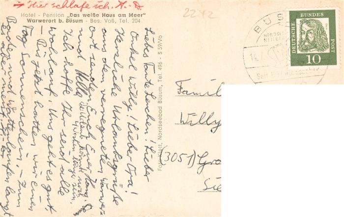 73899661 alte Postkarte Warwerort Nordseebad Panorama Kueste Blick auf die Nordsee Hotel Pension Das Weisse Haus am Meer postalisch gelaufen Erhaltung siehe scans [FriedD77] KatCode: 11110001051121