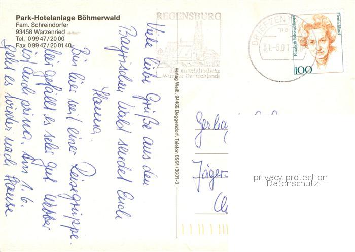 73645969 alte Postkarte Warzenried Park Hotelanlage Boehmerwald Restaurant Wildgehege Landschaftspanorama postalisch gelaufen Erhaltung siehe scans [FriedD77] KatCode: 11110009372124
