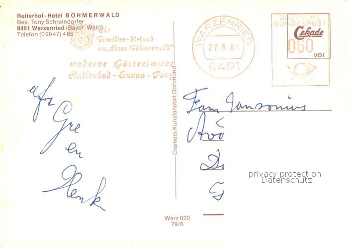 73659782 alte Postkarte Warzenried Reiterhof Hotel Boehmerwald Restaurant Hallenbad postalisch gelaufen Erhaltung siehe scans [FriedD77] KatCode: 11110009372124
