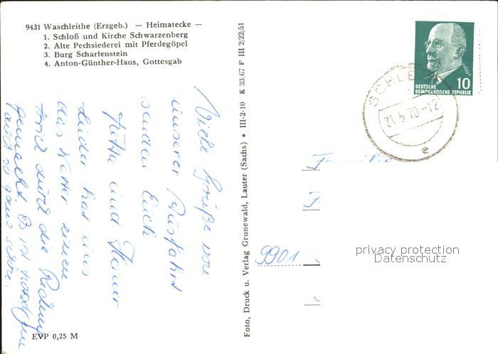 72474676 alte Postkarte Waschleithe Schloss und Kirche Schwarzenberg Alte Pechsiederei Burg Scharfenstein Anton Guenther Haus Gottesgab postalisch gelaufen Erhaltung siehe scans KatCode: 11110014191050