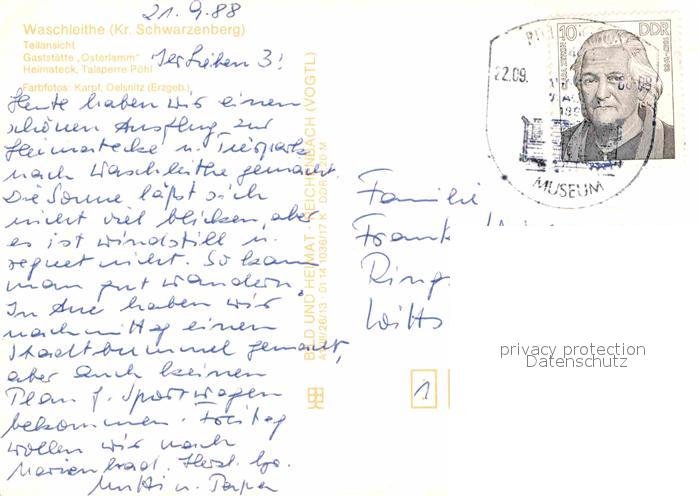 72890593 alte Postkarte Waschleithe Teilansicht Gaststaette Osterlamm Heimateck Talsperre Poehl postalisch gelaufen Erhaltung siehe scans [WerneD78] KatCode: 11110014191050