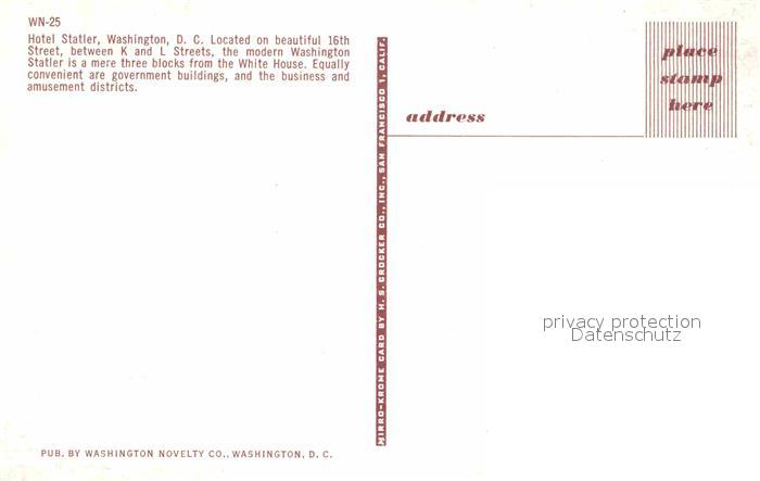 72706687 Washington DC Hotel Stattler postalisch nicht gelaufen Erhaltung siehe scans [LiesaD40] KatCode: 14140090000000