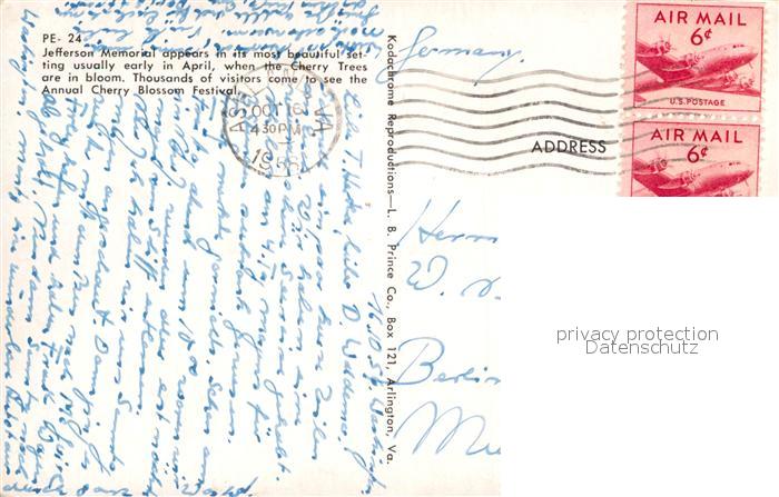 72926897 old postcard Washington DC Jefferson Memorial postalisch gelaufen Erhaltung siehe scans [NatalD47] KatCode: 14140090000000