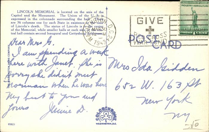 71060427 old postcard Washington DC Lincoln Memorial postalisch gelaufen KatCode: 14140090000000