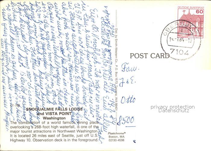 72521626 old postcard Washington DC Snoqualmie Falls Lodge and Vista Point postalisch gelaufen Erhaltung siehe scans KatCode: 14140090000000