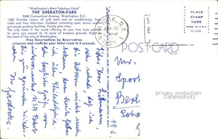 72482821 old postcard Washington DC Washington Most Fabulaus Hotel Sheraton-Park postalisch gelaufen Erhaltung siehe scans KatCode: 14140090000000