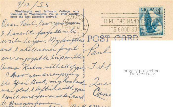 73768317 old postcard Washington Pennsylvania Washington and Jefferson College and Campus postalisch gelaufen Erhaltung siehe scans [LiesaD40] KatCode: 14140410000000