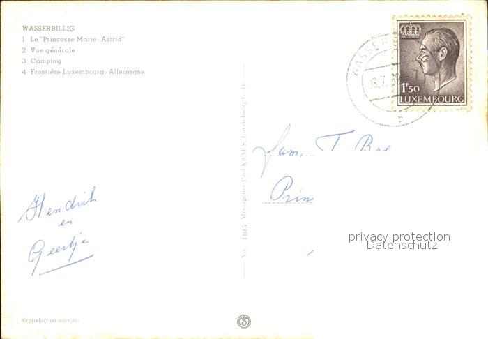 alte Postkarte Wasserbillig Bateau Princesse Marie Astrid Camping Frontiere Luxembourg Allemagne postalisch gelaufen Erhaltung siehe scans