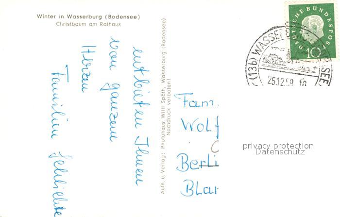 73608504 alte Postkarte Wasserburg Bodensee Christbaum am Rathaus Weihnachtskarte Neujahrskarte postalisch gelaufen Erhaltung siehe scans [FriedD77] KatCode: 11110009776128