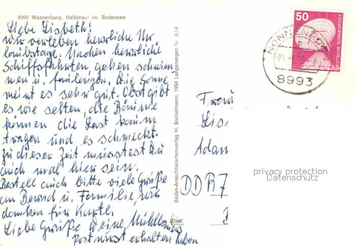 72857381 alte Postkarte Wasserburg Bodensee Kirche Schloss Schwimmbad Sparkasse Bootshafen Ortsmotiv postalisch gelaufen Erhaltung siehe scans [WerneD78] KatCode: 11110009776128