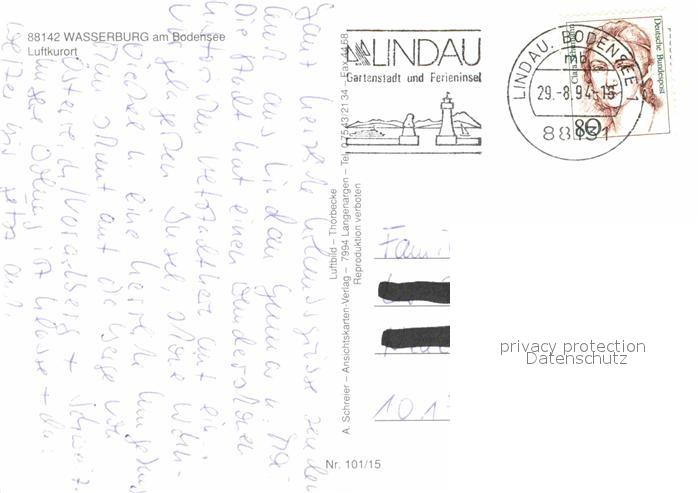 72788033 alte Postkarte Wasserburg Bodensee Luftkurort mit Lindau Alpenkette Fliegeraufnahme postalisch gelaufen Erhaltung siehe scans [FriedD77] KatCode: 11110009776128