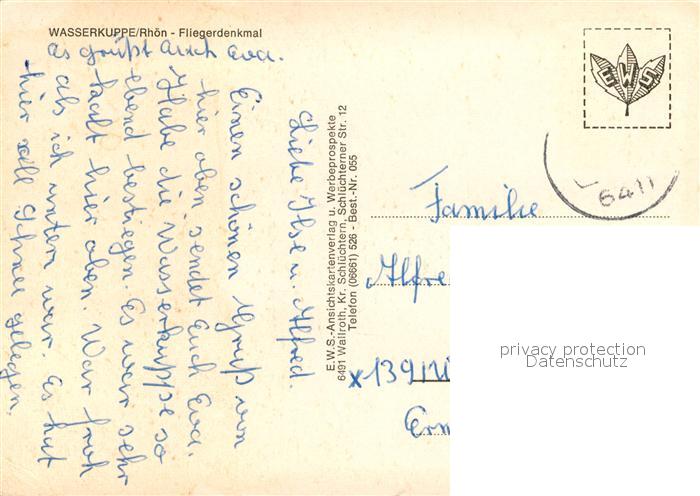 73152622 alte Postkarte Wasserkuppe Rhoen Fliegerdenkmal Segelflugzeug postalisch gelaufen Erhaltung siehe scans [FriedD77] KatCode: 11110006631021