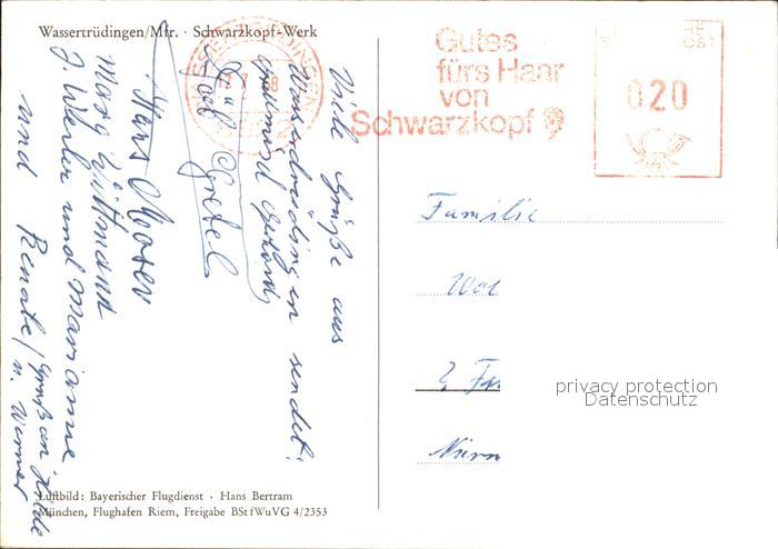 72429110 alte Postkarte Wassertruedingen Schwarzkopf Werk Industrie Fliegeraufnahme postalisch gelaufen Erhaltung siehe scans KatCode: 11110009571214