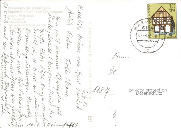 72338749 alte Postkarte Wasungen Pfaffenburg Werra Burg Maienluft Kulturpark Schoeppenwerth Platz der Jugend Fachwerkhaeuser postalisch gelaufen Erhaltung siehe scans KatCode: 11110016066086