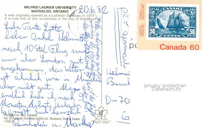old postcard Waterloo Ontario Winfried Laurier University postalisch gelaufen Erhaltung siehe scans [LiesaD40]
