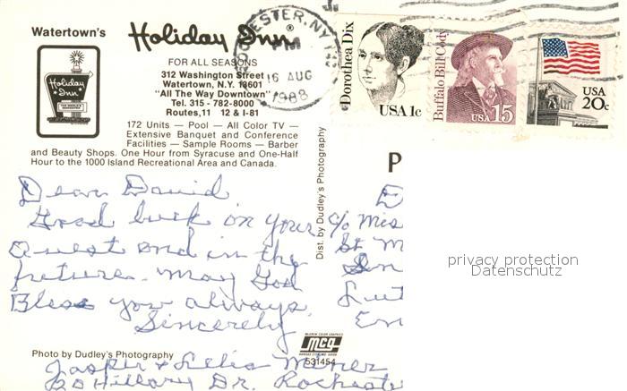 73059027 old postcard Watertown New York Holiday Inn postalisch gelaufen Erhaltung siehe scans [WerneD78] KatCode: 14140340000000