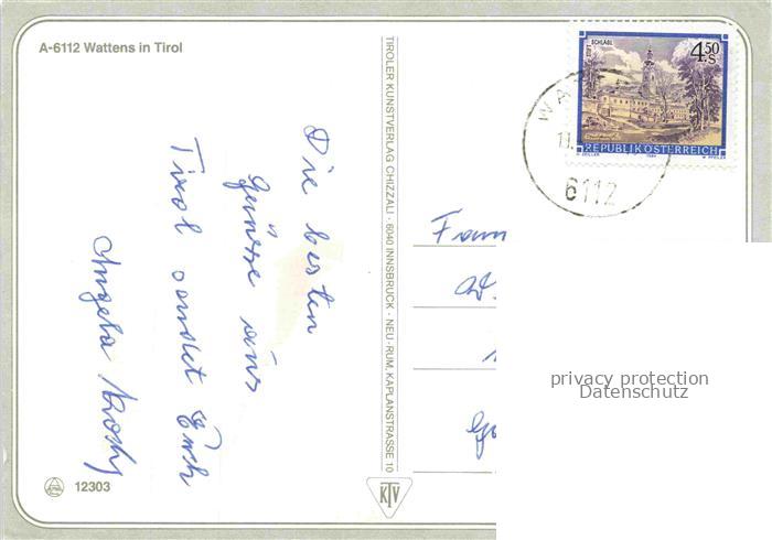 74157546 alte Postkarte Wattens Fritzens Tirol AT Hauptstrasse Kirche Springbrunnen Skulptur Bergpanorama Kapelle Wappen postalisch gelaufen Erhaltung siehe scans [Karloger] KatCode: 11390332070309