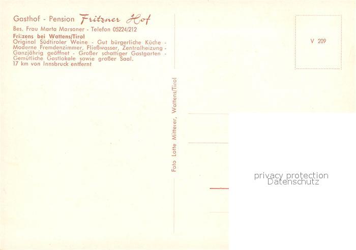 13009996 Wattens Gasthof Fritzner Hof postalisch nicht gelaufen Erhaltung siehe scans [NatalD47] KatCode: 11390332070367