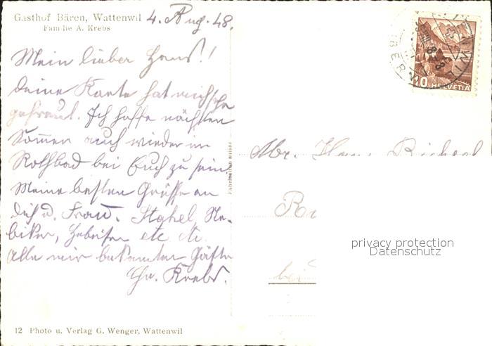 11640054 Wattenwil Gasthof Baeren postalisch gelaufen Erhaltung siehe scans Alte Ansichtskarte Postkarte alte Postkarte Paol Katcode 11470060230708