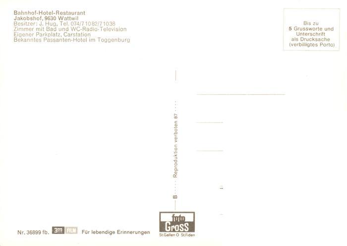 13885578 Wattwil SG Bahnhof Hotel Restaurant Jakobshof postalisch nicht gelaufen Erhaltung siehe scans [WerneD78] KatCode: 11470190585840