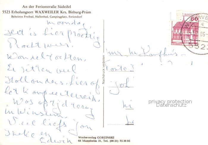 72863737 alte Postkarte Waxweiler Panorama Erholungsort an der Ferienstrasse Suedeifel postalisch gelaufen Erhaltung siehe scans [FriedD77] KatCode: 11110007232322
