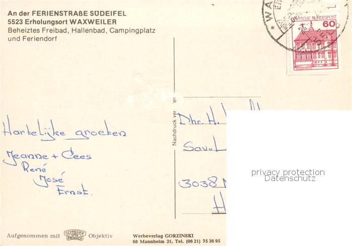 73812648 alte Postkarte Waxweiler Panorama Ortspartien Schwimmbad Musikkapelle Camping postalisch gelaufen Erhaltung siehe scans [WerneD78] KatCode: 11110007232322