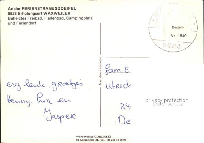 72429814 alte Postkarte Waxweiler Total Strassenpartie Schwimmbad Trachtenkapelle Camping postalisch gelaufen Erhaltung siehe scans KatCode: 11110007232322