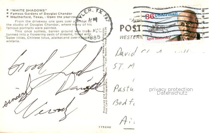 73131703 old postcard Weatherford Texas White Shadows Gärten von Douglas Chandor postalisch gelaufen Erhaltung siehe scans [KathaD81] KatCode: 14140460000000