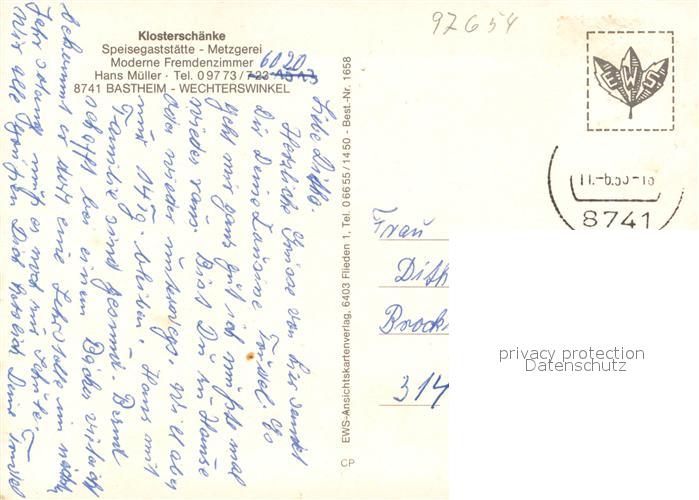 73672042 alte Postkarte Wechterswinkel Klosterschaenke Gaststaette Metzgerei Ortsansicht mit Kirche Bruecke postalisch gelaufen Erhaltung siehe scans [FriedD77] KatCode: 11110009673116