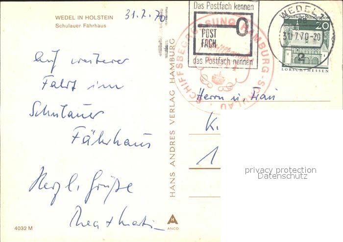 72031847 alte Postkarte Wedel Pinneberg Schulauer Faehrhaus Willkomm Hoeft Schiffsbegruessung postalisch gelaufen Erhaltung siehe scans KatCode: 11110001056050