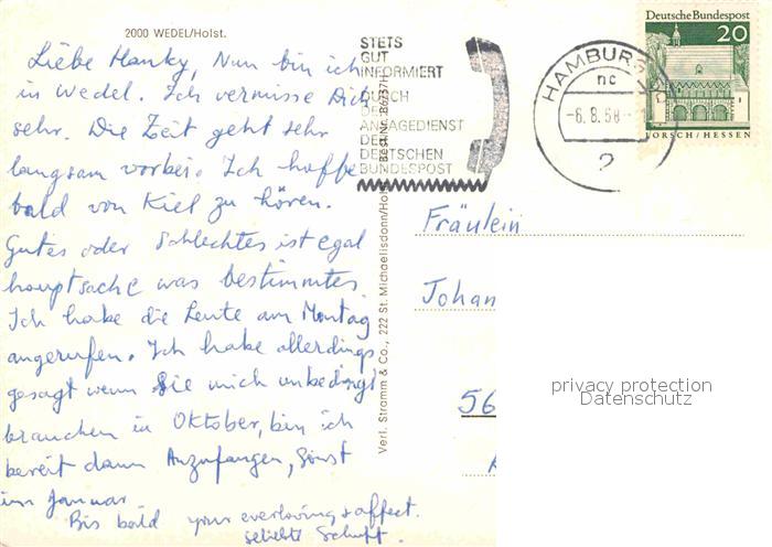 72679417 alte Postkarte Wedel Pinneberg Strand Hafenpartie Denkmal Wohnblocks postalisch gelaufen Erhaltung siehe scans [WerneD78] KatCode: 11110001056050