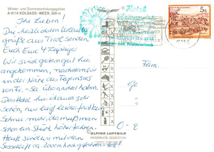 73904822 alte Postkarte Weer Kolsass Tirol AT Winter- und Sommererholungsgebiet Alpen postalisch gelaufen Fliegeraufnahme Erhaltung siehe scans [FriedD77] KatCode: 11390335070937
