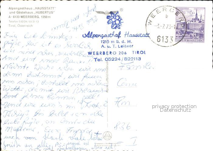72591312 alte Postkarte Weerberg Alpengasthaus Hausstatt Gaestehaus Hubertus Fliegeraufnahme postalisch gelaufen Erhaltung siehe scans [WerneD78] KatCode: 11390335070938